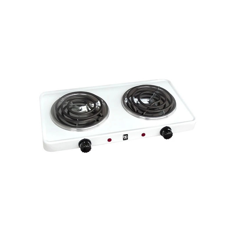 Estufa de mesa y controles de temperatura duales. El diseño del quemador en espiral distribuye el calor de manera uniforme.