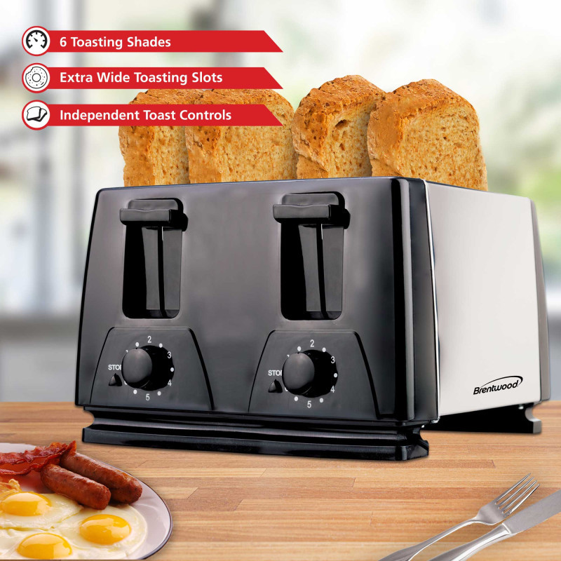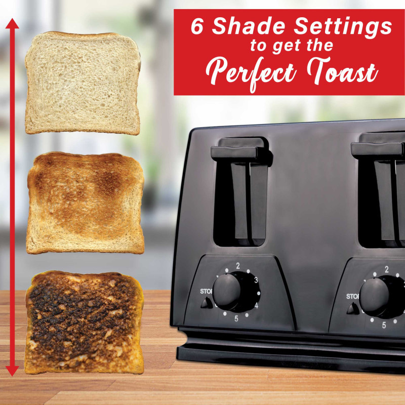Tostadora de 4 rebanadas de 1300 vatios para ahorrar tiempo por la mañana al preparar el desayuno para la familia. Elija el nivel de tostado con los diales de 6 configuraciones, de claro a oscuro.