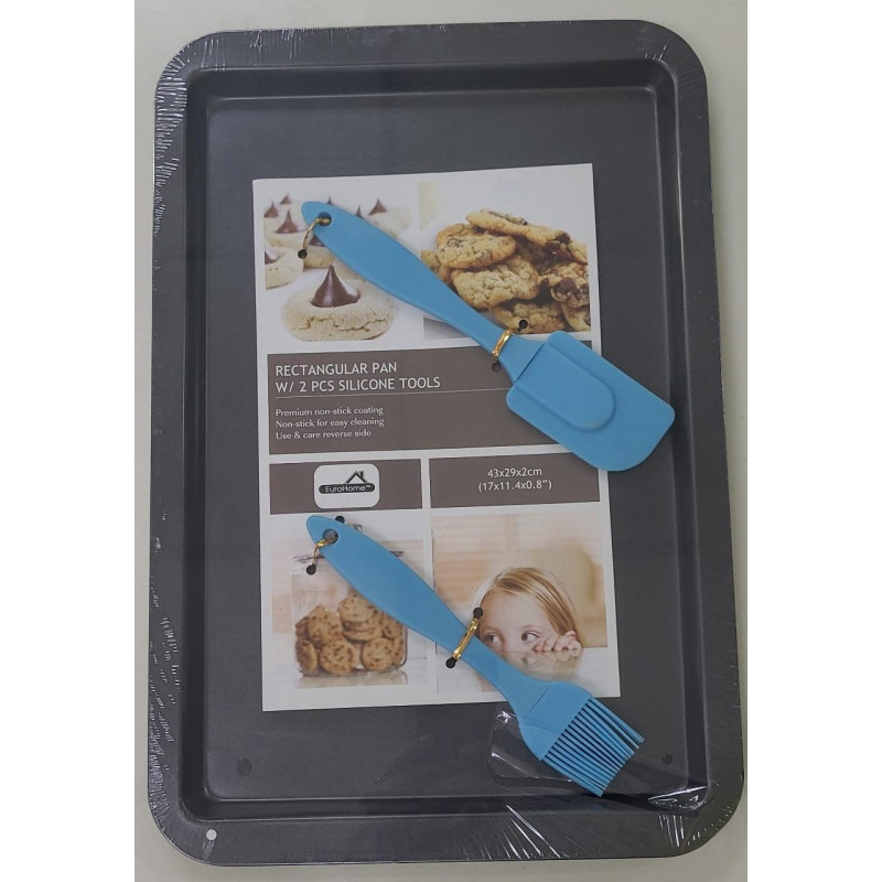 Bandeja para hornear con recubrimiento antiadherente y incluye 1 brocha y 1 espatula de silicon.